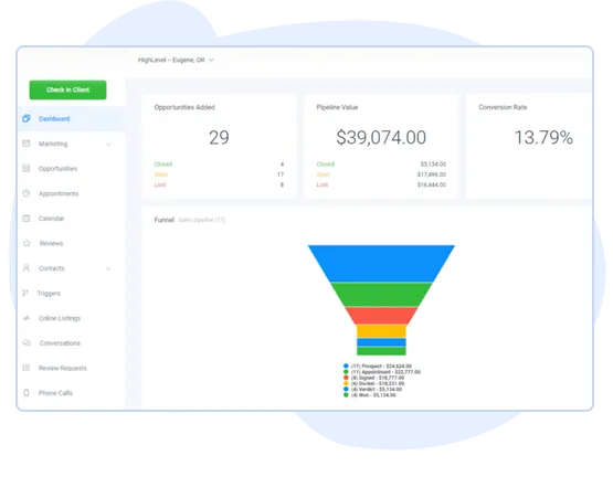 Build forms and funnel pages to capture leads, user automated sms, email, phone calls, voicemails, and Facebook Messages to nurture leads through custom pipelines, converse with leads & clients via text, phone, and Facebook Messenger (all in one stream!), and more!